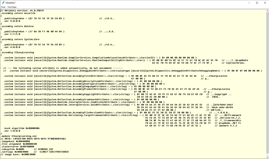 MANIFEST里面有reference的内容,引用了AutoFac,有token和版本。下面还有module的列表,这个exe里面只有CSharpLearning.exe一个module。